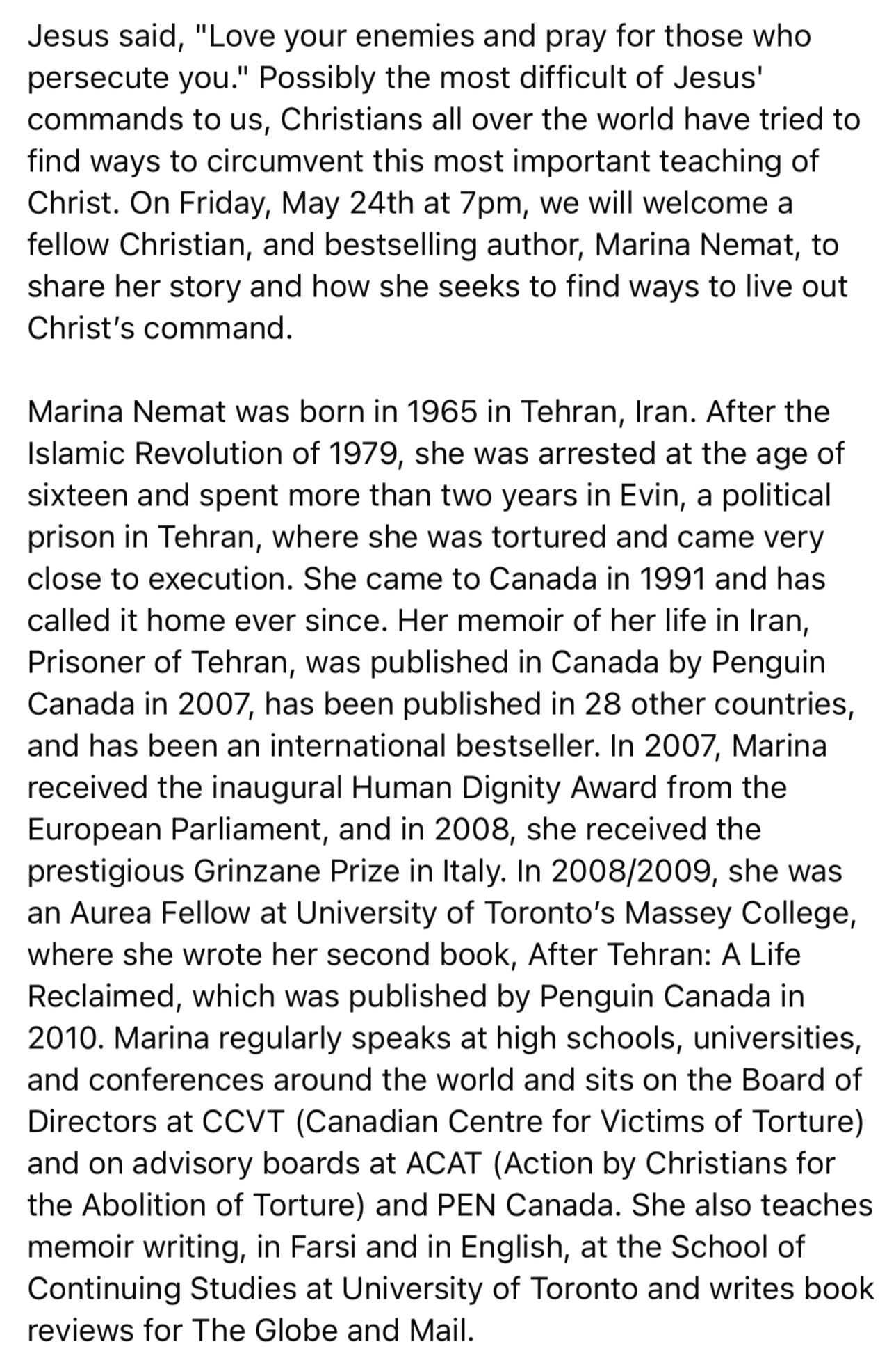 I do not look back on it as a nice parish program with a notable guest. I look back on it as a warning and a witness. Marina Nemat did not come offering cheap absolution. She came as someone who had passed through terror and still insisted that the human soul must not be handed over entirely to vengeance. That is not softness. That is moral defiance.