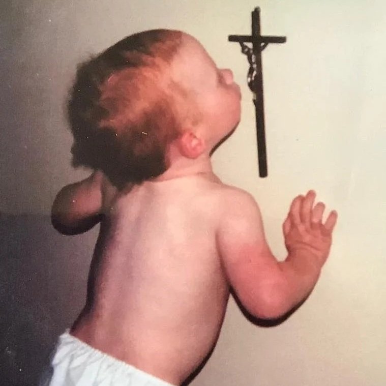 This is me as a little boy, reaching toward a crucifix on the wall. Bare-backed. Unsteady. Curious. Drawn toward the broken body of Christ before I had words for doctrine, betrayal, power, or pain. Before I knew what institutions would protect—and what they would not. Before I knew what families could normalize. Before I knew how often religion can speak the language of love while hiding from the truth.